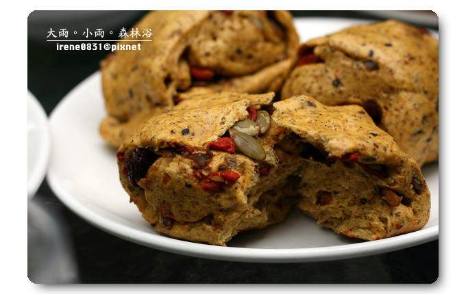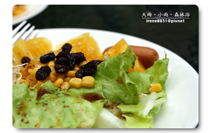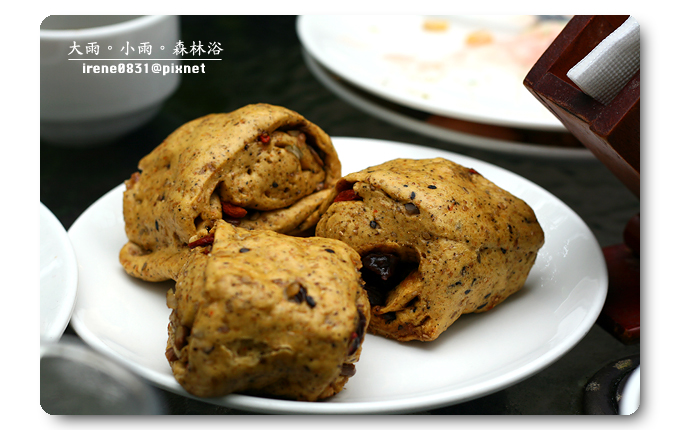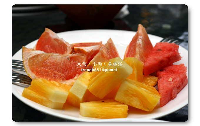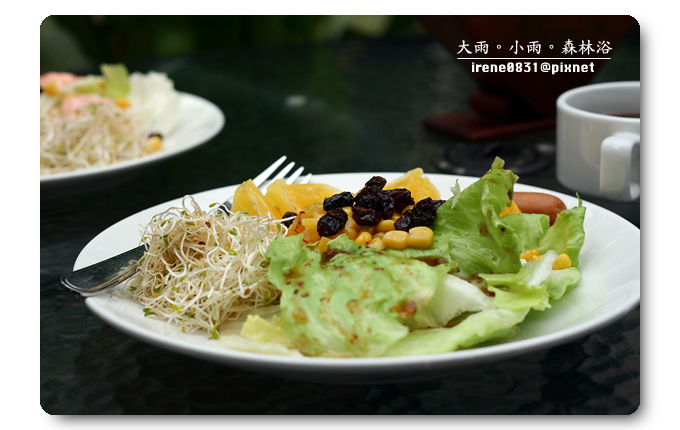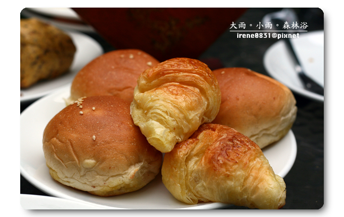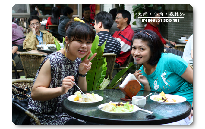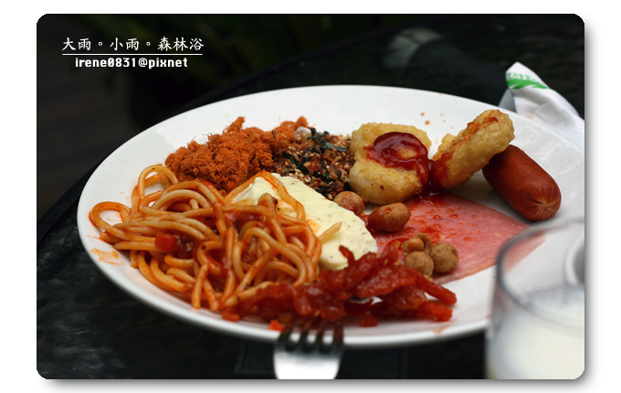 特意挑了一個戶外的座位,既然有機會來到明池,那一定不能放過大吸芬多精的機會,早上的天氣稍有涼意,披上外套的噗小翠不覺涼意,這種溫度剛剛好。早餐是噗小翠最注重的一餐,尤其在假日吃早餐,一定要吃得慢條斯理細細品嚐,催不得的。我喜歡跟眾姐妹一起出門玩耍,因為大家對彼此互相了解,我們清楚對方的喜好,而大家總是抱著互相扶持的心情,所以...有人拿餐點的時候,座位上就一定有人負起重責大任,替大家看緊家當。因為噗小翠吃得慢吃得多,是明池提供的早餐實在是太好吃了,姐妹拿什麼我就吃什麼,而且是吃得津津有味(我想...是姐妹清楚我的喜好,也避開我討厭的食物吧!)一頓早餐,我們這一房大概吃了有一個小時之久吧!讓另外一房的姐妹們大呼~你們會不會吃太久啦??什麼我們吃得久,明明就是妳們睡太晚,吃太快,上山來度假,就是吃得好吃得多是一定要的啊!(嘻~東西好吃咩!)