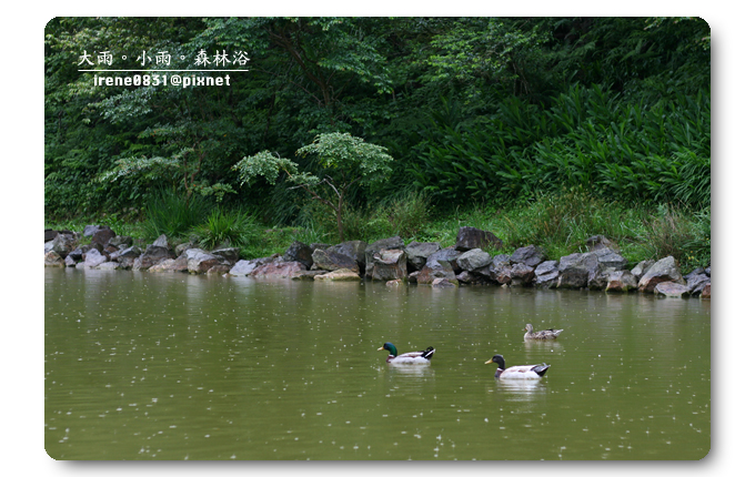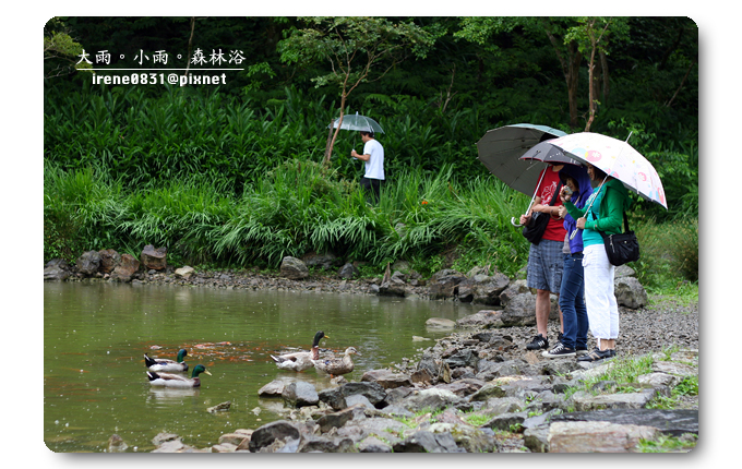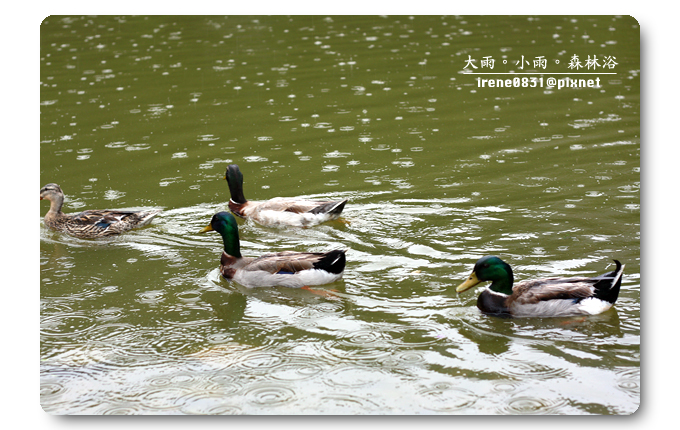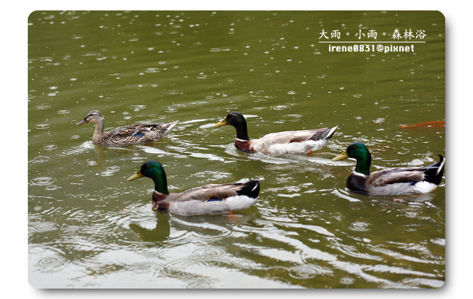 撐著傘佇立在天池旁,看著不偎風雨的綠頭鴨,